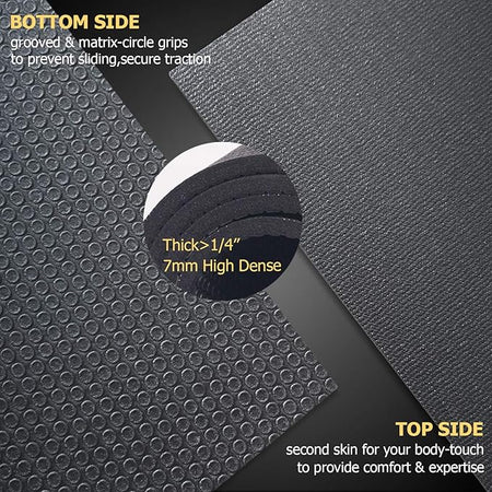 The spacious mat has double-sided no-skid surfaces for enhanced traction and superior grip. Grooved & matrix-circle underside stops the mat from sliding on the floor. The subtly textured surface prevents hands and feet from slipping out of position to prevent injuries. Work great for all floors, like carpet, tile or wood floor in the living or bedroom, and concrete in the garage, patio or basement.