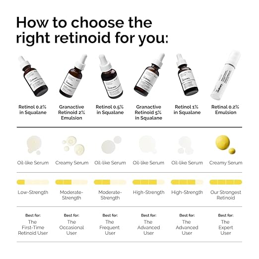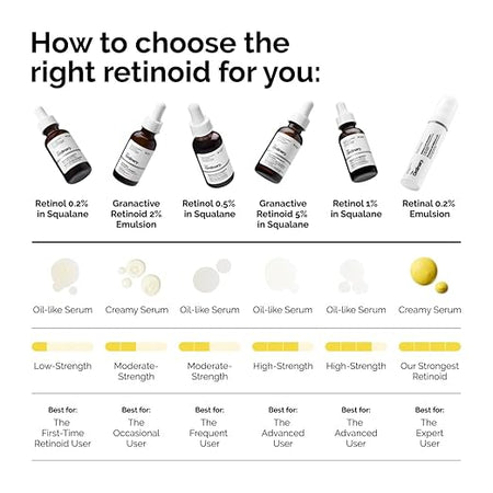 The Ordinary Tip: Start with Retinol 0.2% in Squalane and slowly work your way up to Retinol 0.5% in Squalane and Retinol 1% in Squalane. That said, if you are prone to sensitivity, you may prefer to use newer retinoid technologies, such as those found in our Granactive Retinoid 2% Emulsion.